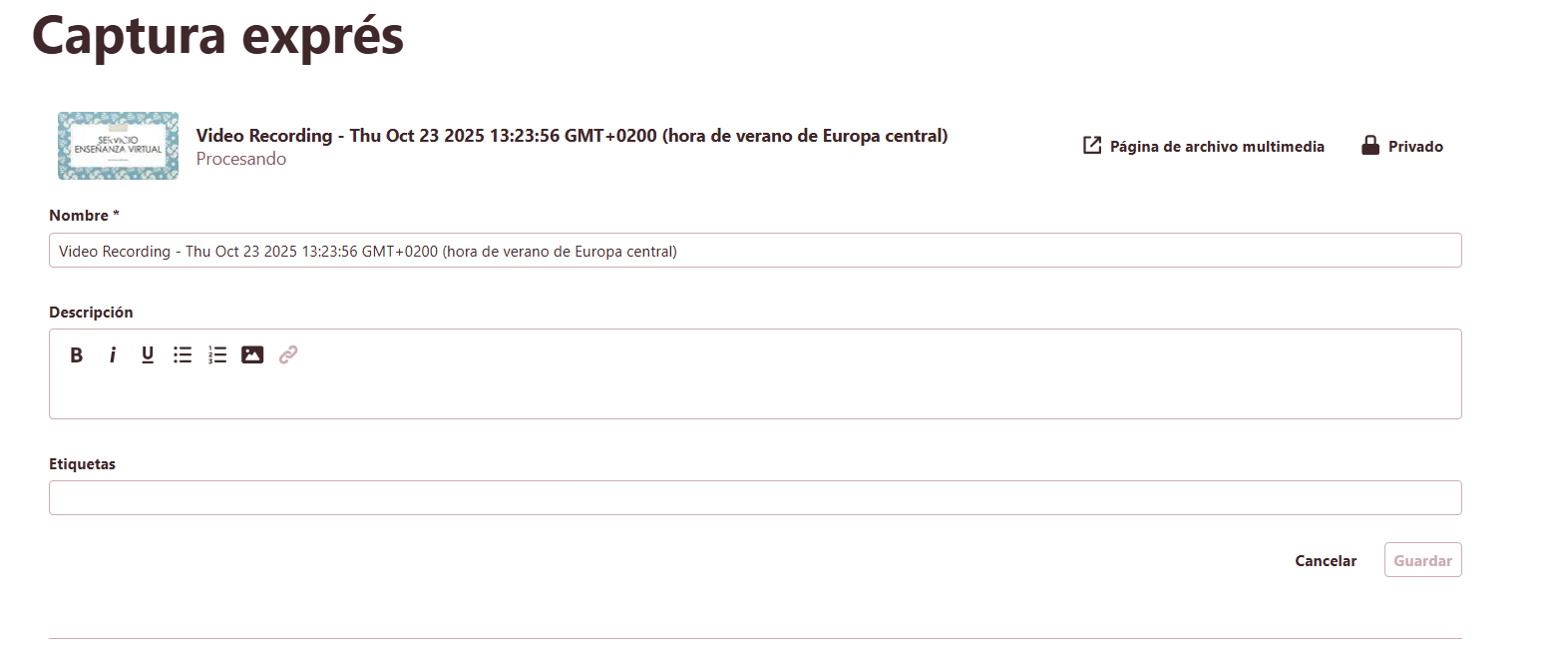 Cuando pulsa Usar este, aparece una nueva ventana donde debe modificar el nombre del archivo y añadirle etiquetas. Luego pulse Guardar para que quede almacenado entre Mis Archivos Multimedia.
